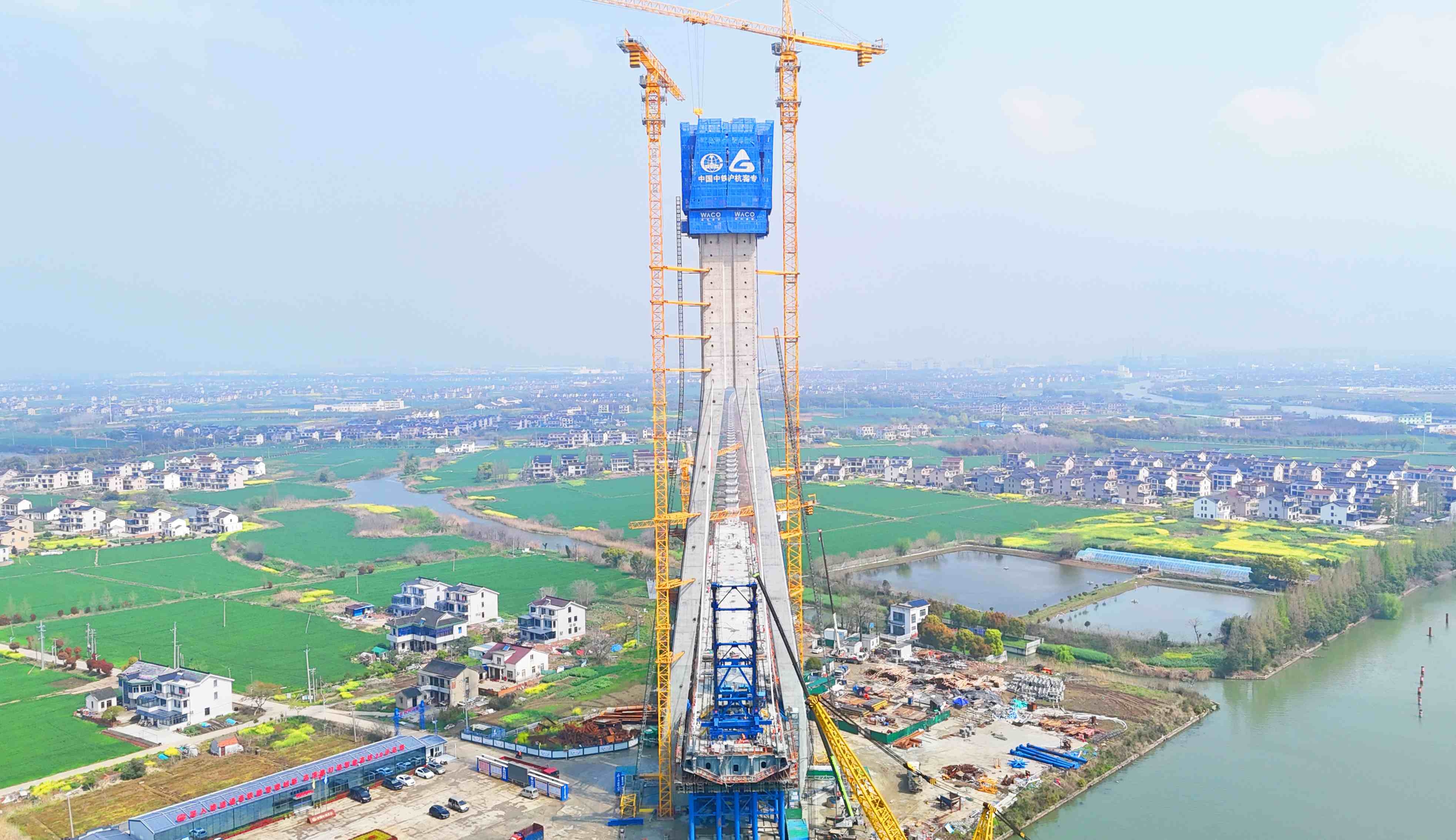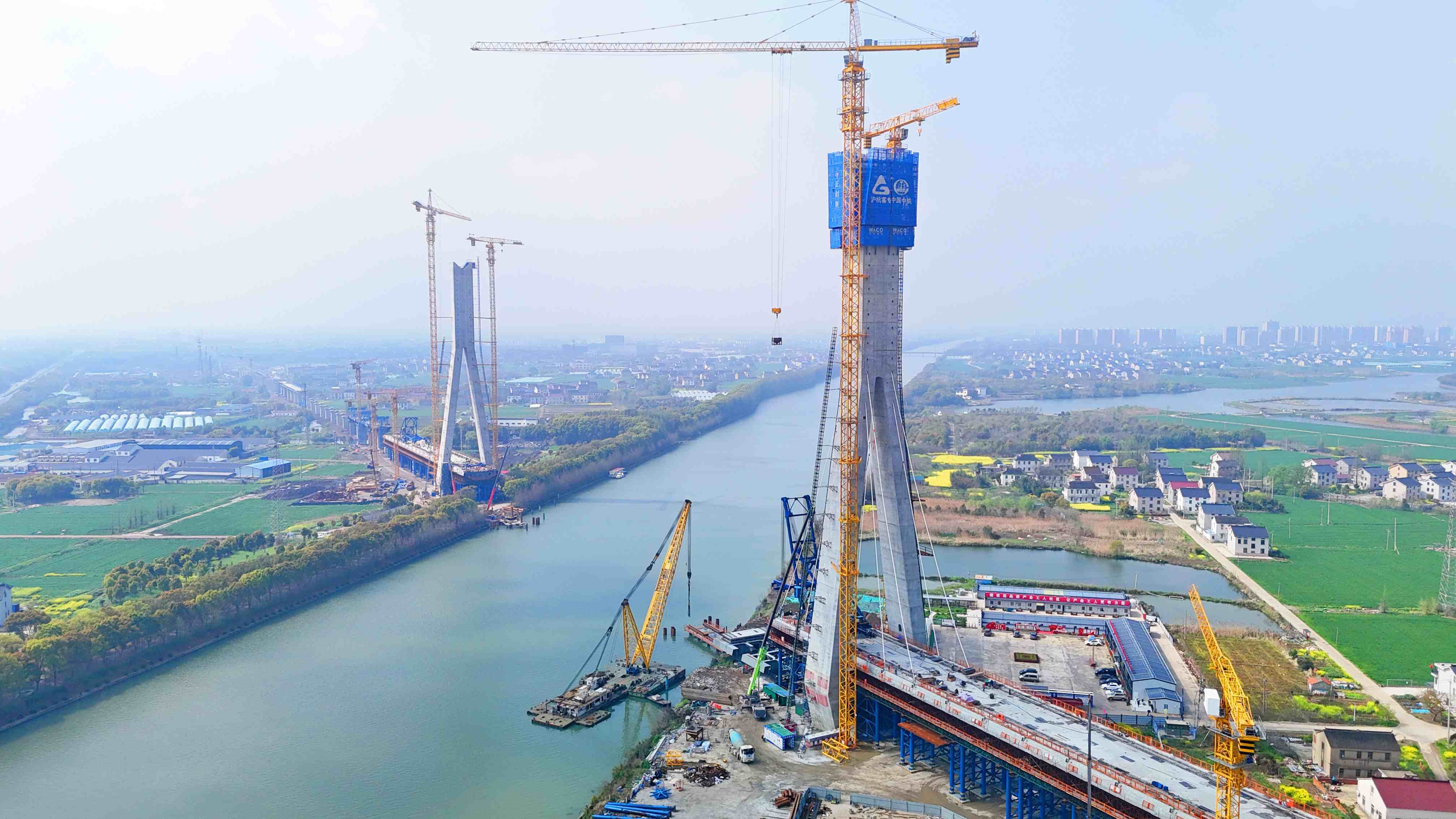 望虞河斜拉桥是全线重点工程,全长679.5米,为双塔双索面钢混结合梁斜拉桥,268号主塔高124.1米、269号主塔高118.2米,主跨长348米。本次封顶的268号主塔采用钻石型桥塔设计,由上、中、下塔柱及下横梁组成,通过支座及斜拉索与主梁连接。