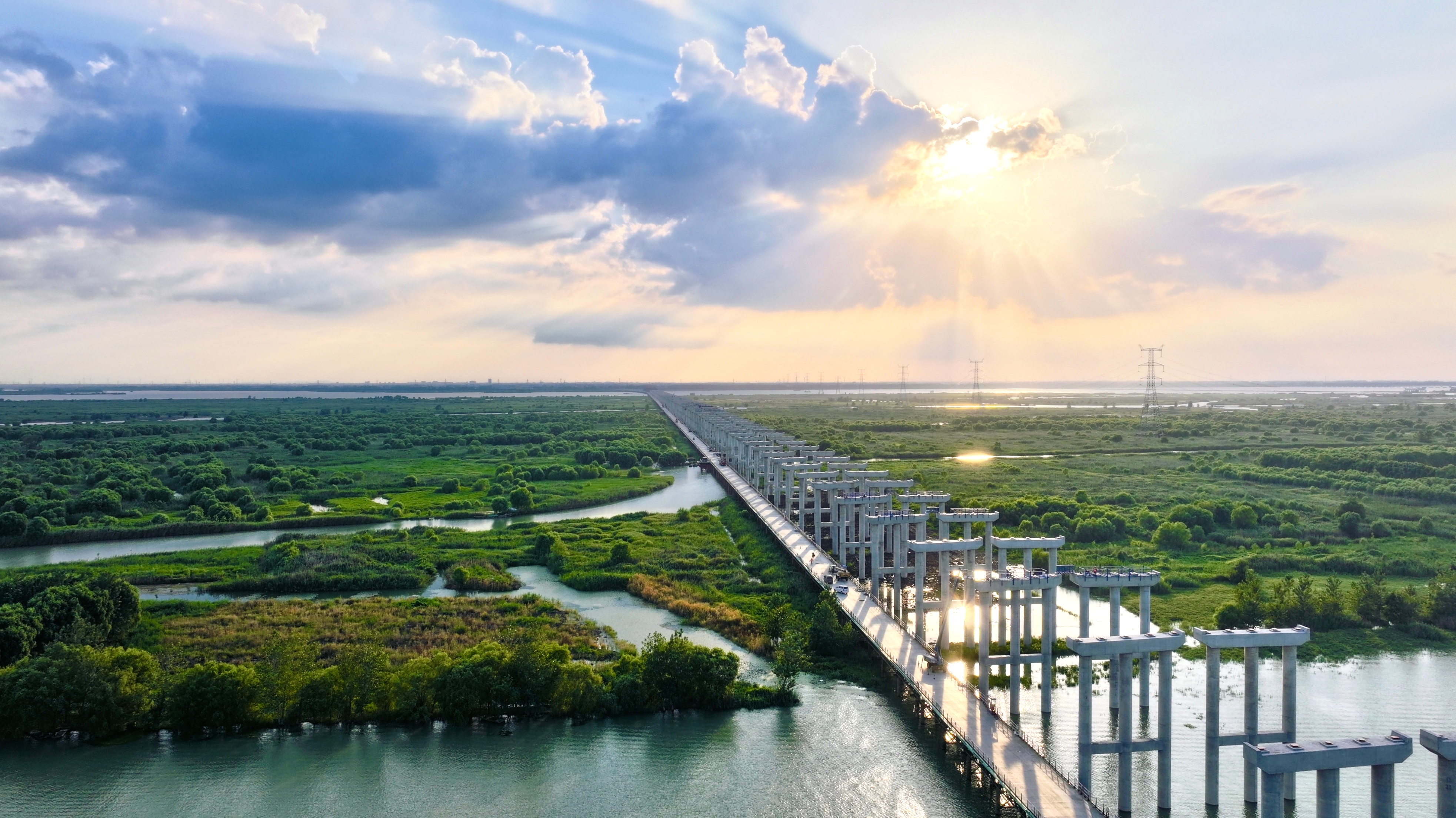 中铁七局参建的南京至盐城高速公路(简称宁盐高速)是江苏省“六纵十横十五射”高速规划网中“射三”的重要组成部分,线路全长126.6公里。中铁七局承建宁盐高速扬州5标,其中,全线控制性工程、全长约8.8公里的高邮湖特大桥,穿越高邮湖和邵伯湖两个湿地自然保护区,跨越淮河入江水道及京杭大运河,区域内保护动植物种类繁多。项目团队搭建全链条绿色防控体系,布设鸟类观测站,采用封闭施工、错峰作业等方式守护湿地生态。同时,落实边建边绿、及时复垦绿化,配套智能降尘与清洁设备,推行污水循环、固废处置、节能降碳举措,全力打造绿色工程。